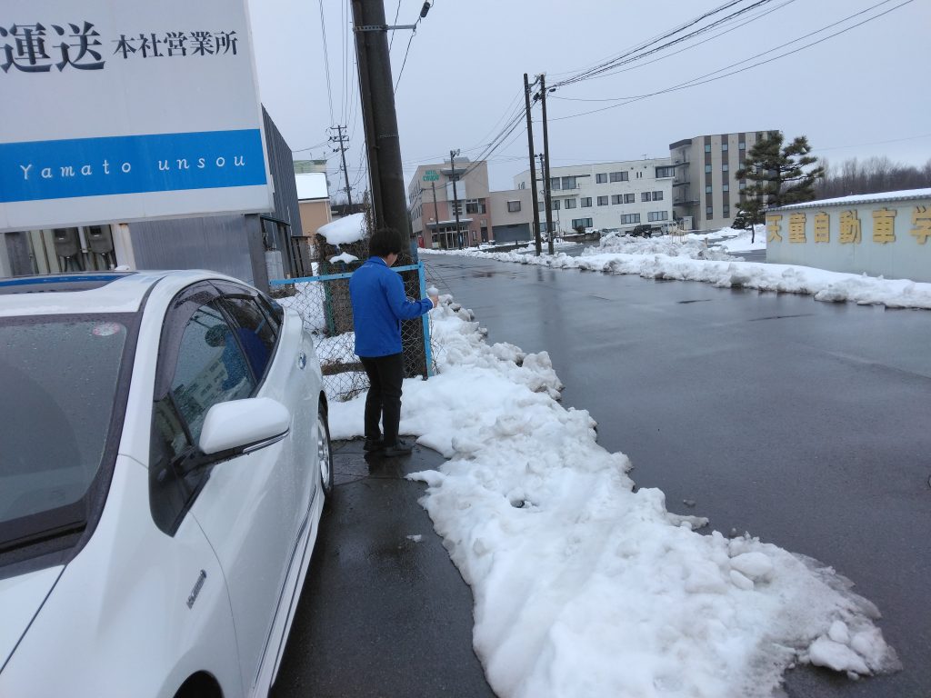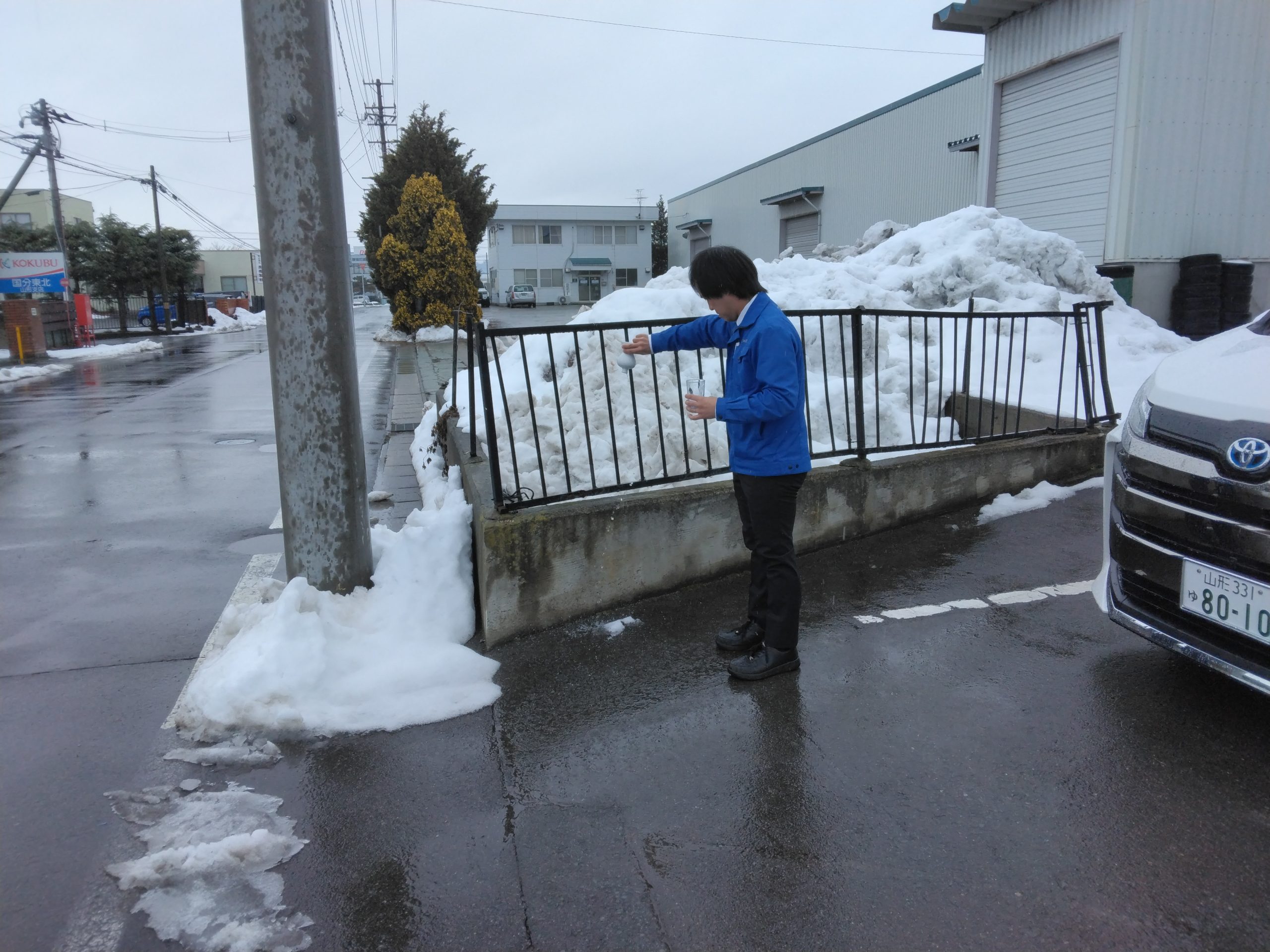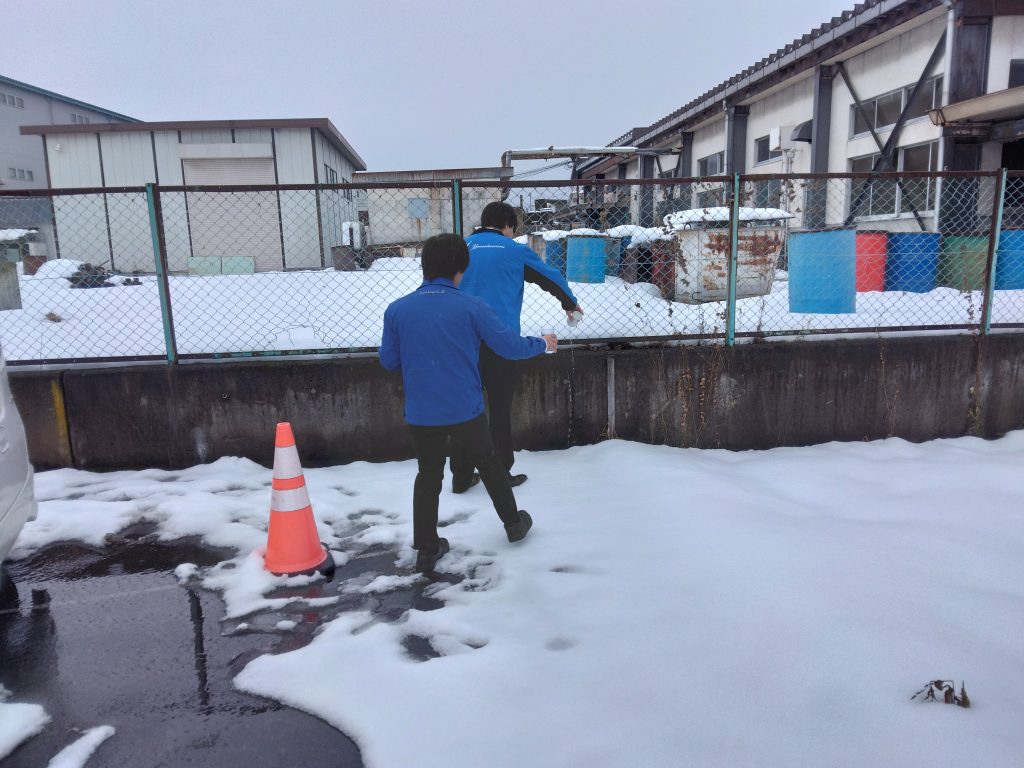 画像は御祈祷の後に会社敷地の四隅にお清めの日本酒とチェイサーでお水を撒いているところです。