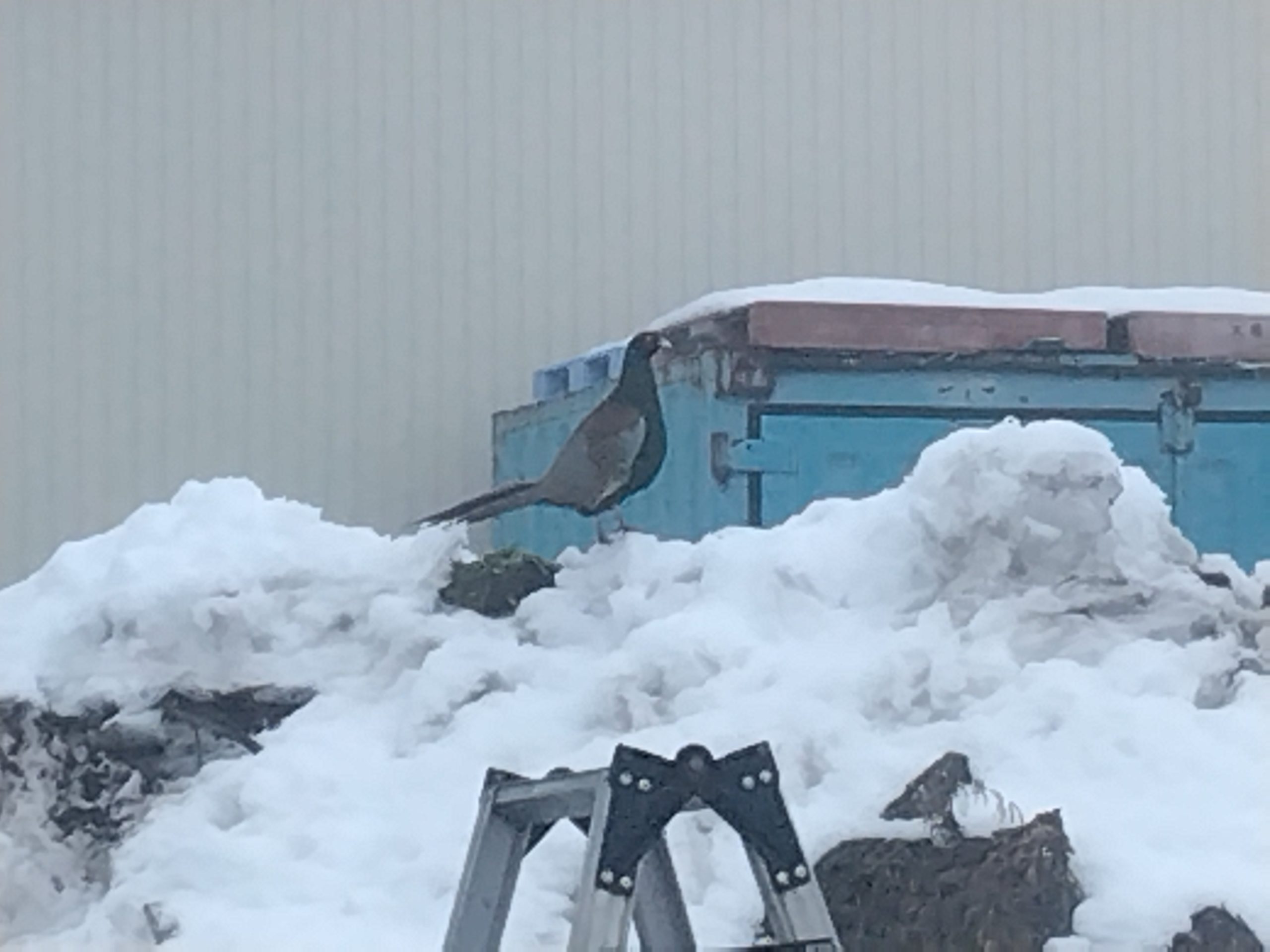 隣地にできた除雪された雪山の上にどーんと現れたのは雉(きじ)。このコーナー2回目の登場、前回の個体よりも大きさがありスマートフォンのカメラを向けても悠然としている様子です。この雪が積もる時期はこいつ何を食べているんでしょうか?