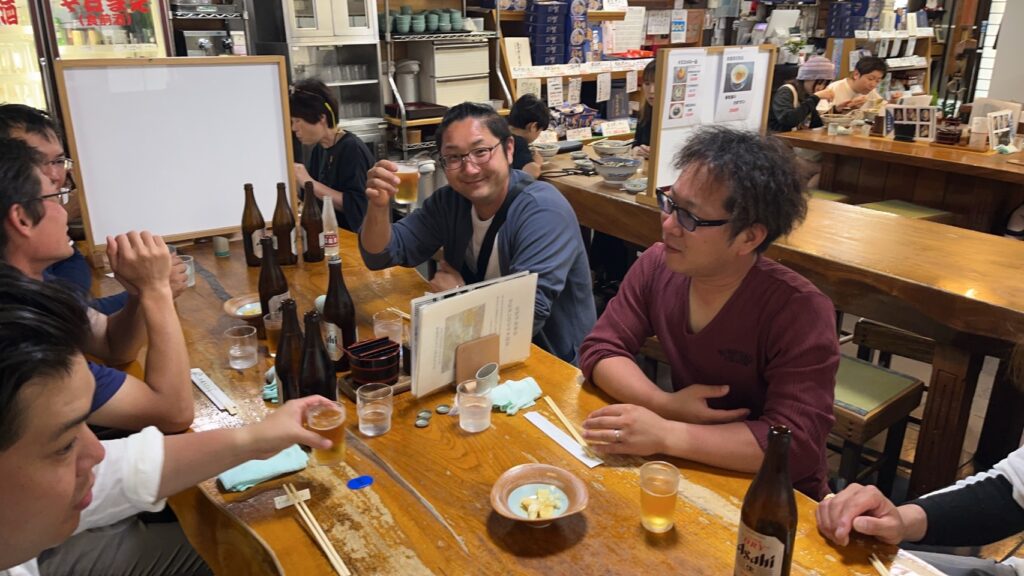 記念大会のあとは、山形県が世界に誇る一大温泉観光地『天童温泉』にてしめやかに打ち上げを開催しました。まずは打ち上げ前の練習を水車そばにて一杯。